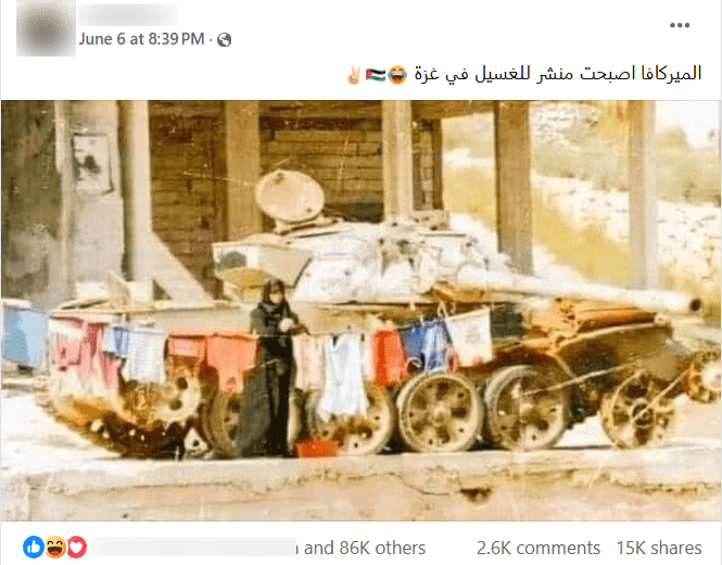هذه الصورة لسيدة تنشر الملابس على دبابة مدمرة في بلدة ياطر اللبنانية عام 2002 وليس من غزة
