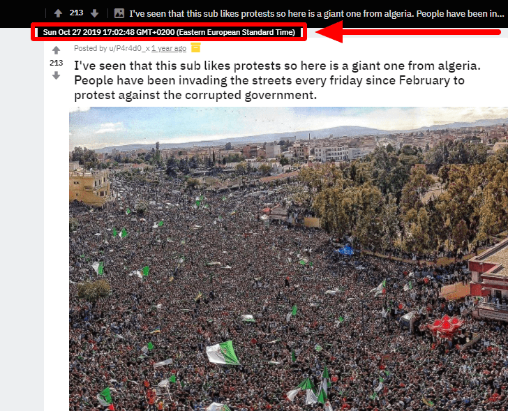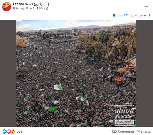 انتشرت على موقع التواصل الاجتماعي فيسبوك صورة مظاهرات حاشدة تحمل علم الجزائر وادعى ناشرو الصورة بأنها حديثة من مظاهرات الجزائر