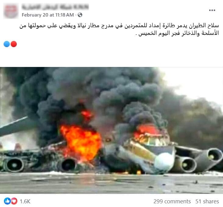 بحسب فرانس 24 –دون تصرف-: «يشهد السودان منذ نيسان/أبريل 2023 حربا أهلية طاحنة بين الجيش بقيادة عبد الفتاح البرهان وقوات الدعم السريع بقيادة محمد حمدان دقلو “حميدتي”. ويتهم الطرفان بارتكاب جرائم حرب، بما في ذلك استهداف المدنيين والقصف العشوائي على الأحياء السكنية والأسواق والمستشفيات.» في هذا السياق تداول ناشطون على الفيسبوك صورة يدعون أنها تصور قيام سلاح الطيران التابع للجيش السوداني بتدمير طائرة إمداد لقوات الدعم السريع في مدرج مطار نيالا.