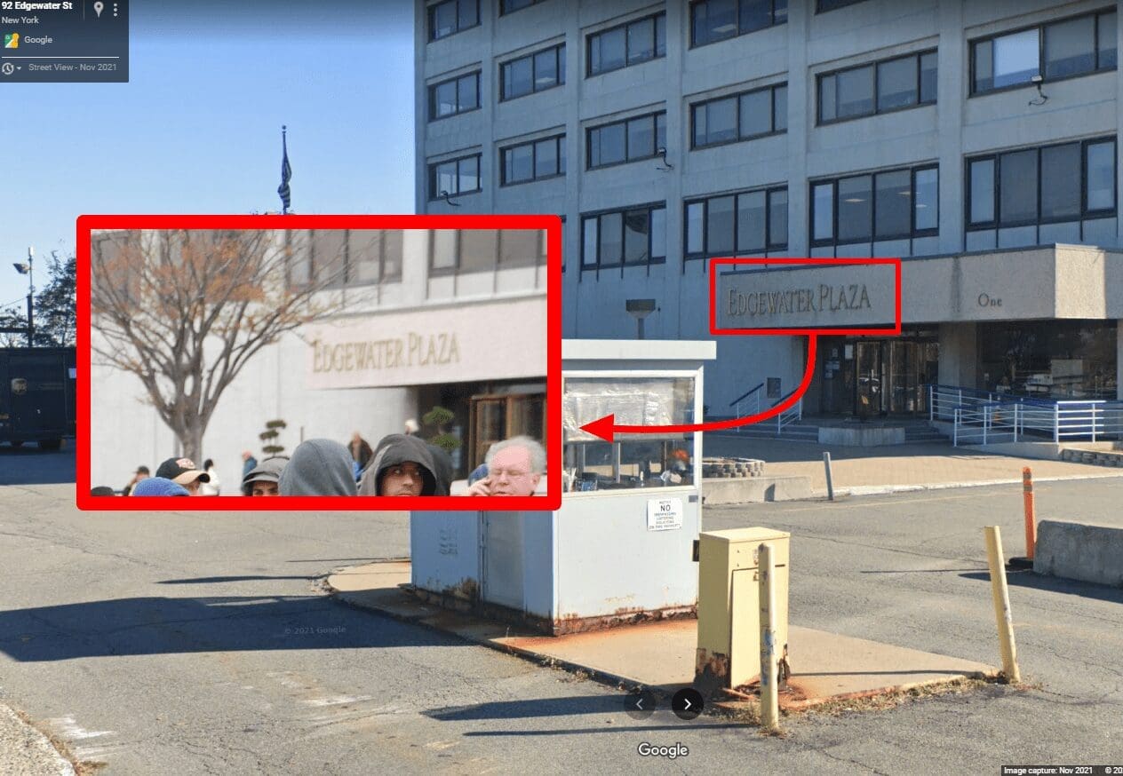 للمنطقة المتوفرة على خرائط جوجل، تبين أنه موجود في مدينة نيويورك ويمكن مطابقته مع معالم المنطقة الظاهرة في صورة الادعاء،