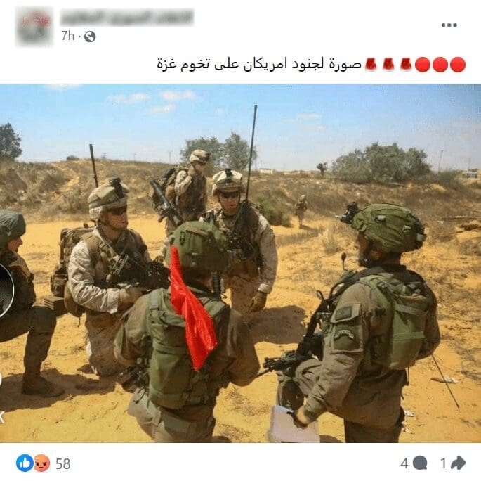 تناقل ناشطون على الفيسبوك صورة يدّعي ناشروها أنها تظهر صورة لجنود أمريكيين على حدود غزة.
