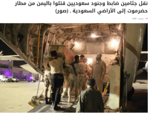 حيث نشرها موقع صحيفة القدس العربي في 20 سبتمبر 2019 ضمن تقرير بعنوان – دون تصرف-: “نقل جثامين ضابط وجنود سعوديين قتلوا باليمن من مطار حضرموت إلى الأراضي السعودية”.