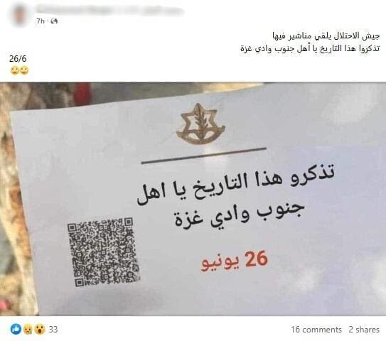 فيما تبين أن المنشور الأصلي كان يحمل النص التالي – دون تصرف -: « إلى سكان القرارة، خربة الخزاعة، عبسان وبني سهيلة، عليكم الاخلاء فورًا والتوجه إلى الملاجئ في منطقة رفح. مدينة خان يونس هي منطقة قتال خطيرة. لقد أعذر من أنذر. جيش الدفاع الإسرائيلي».