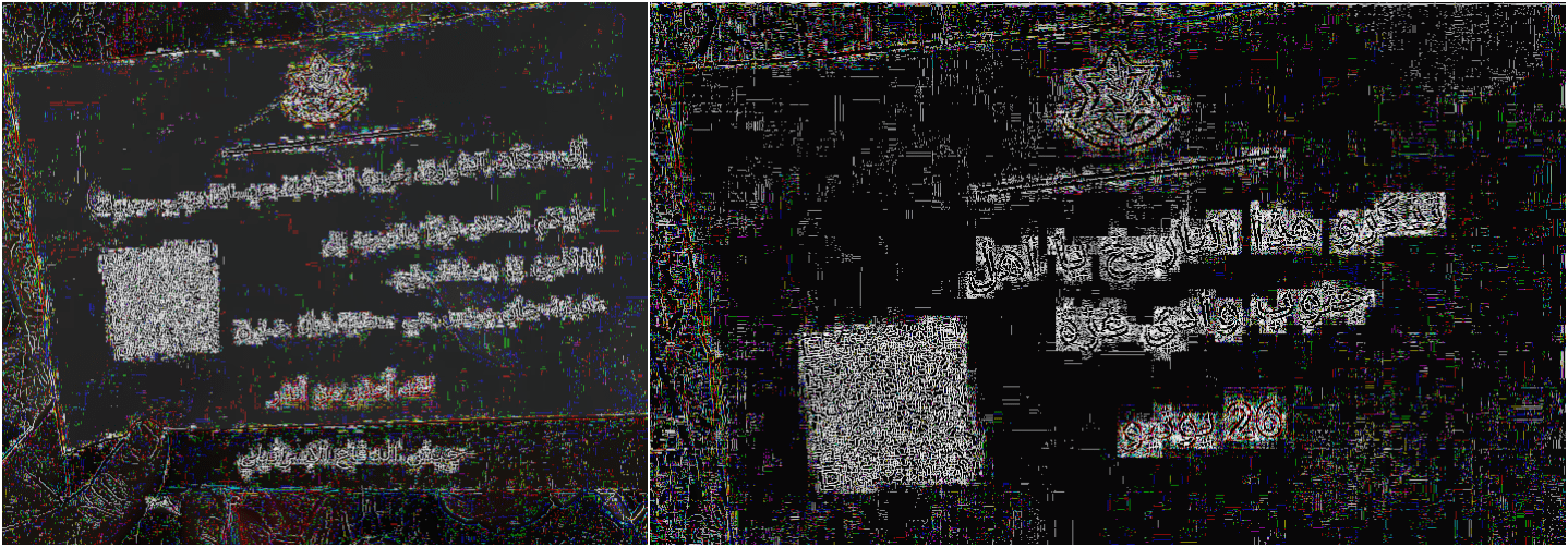 مقارنة نتيجة تحليل مستوى التشويش لصورة الادعاء (يمين) مع نتيجة التحليل للصورة الأصلية (يسار)