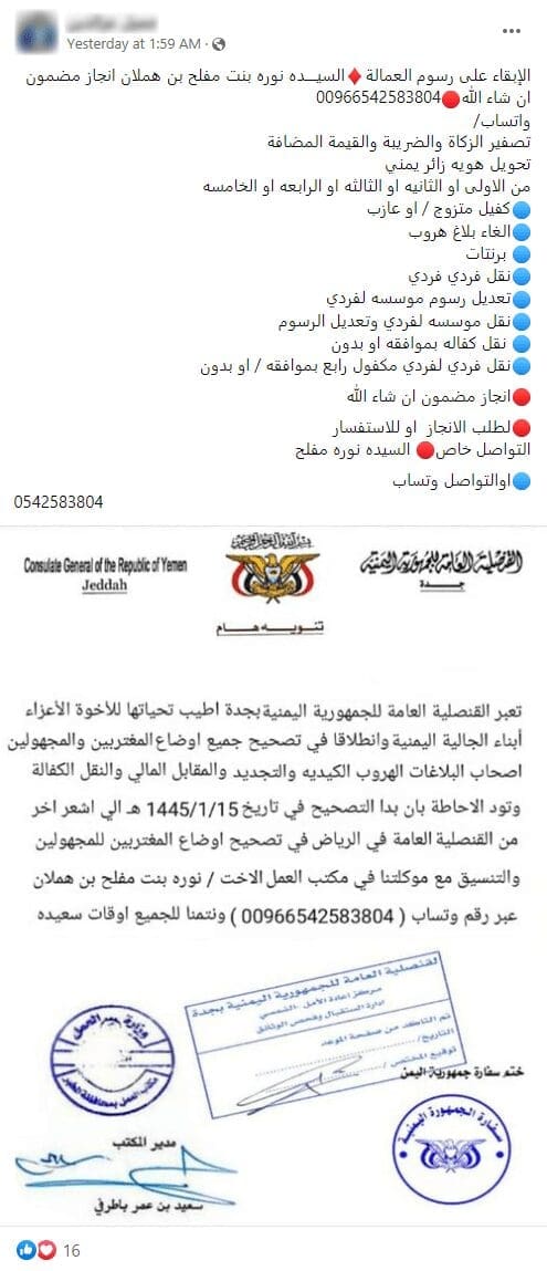 تناقل ناشطون على الفيسبوك صورة لوثيقة يدّعي ناشروها أنها تبين بيانًا صادرًا عن القنصلية اليمنية في جدة حول إنجاز معاملات المغتربين اليمنيين في السعودية.
