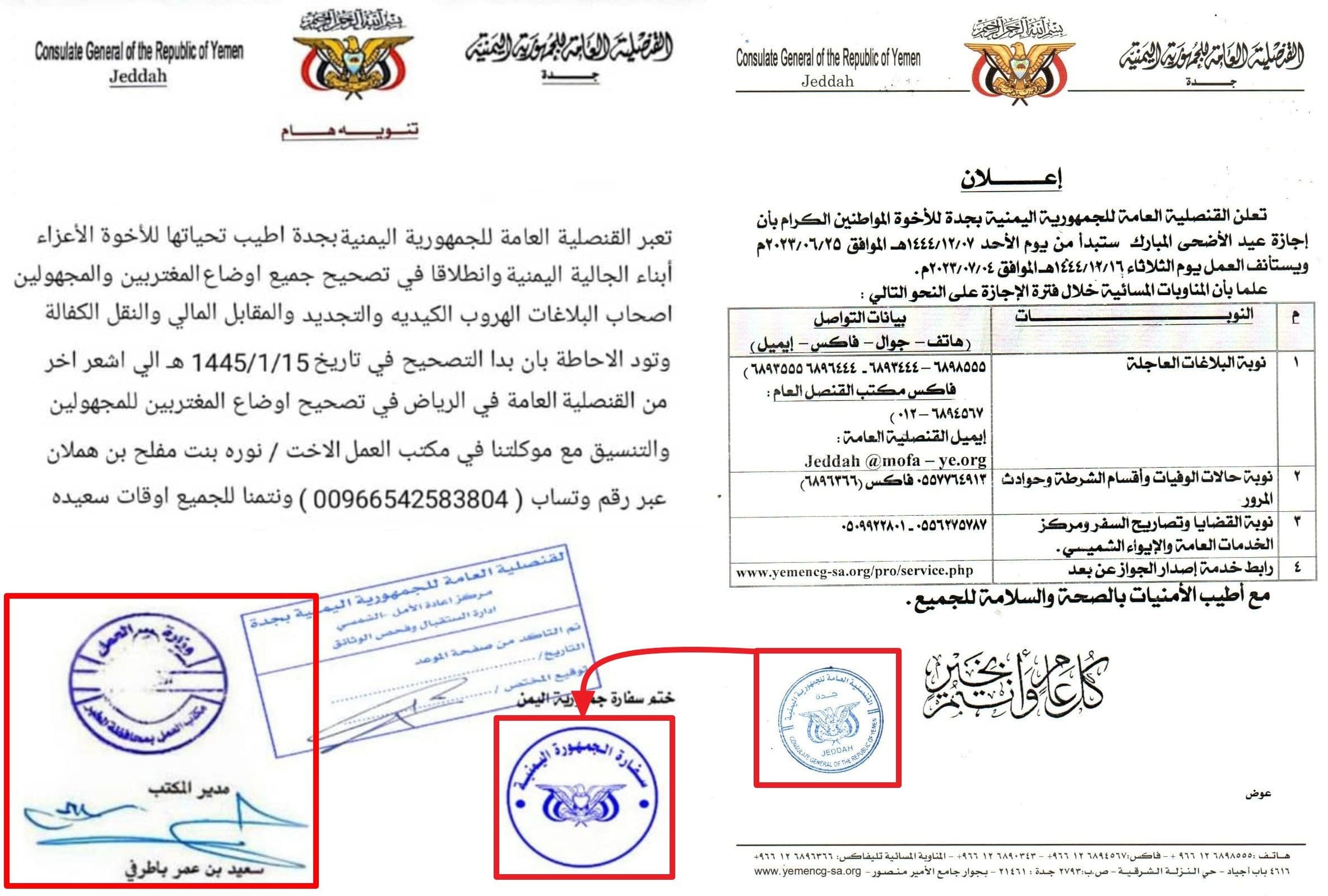 إلى ذلك؛ بتتبع أحدث إعلان نشر على صفحة القنصلية اليمنية بجدة، نجد اختلافًا في الختم كما يلي،