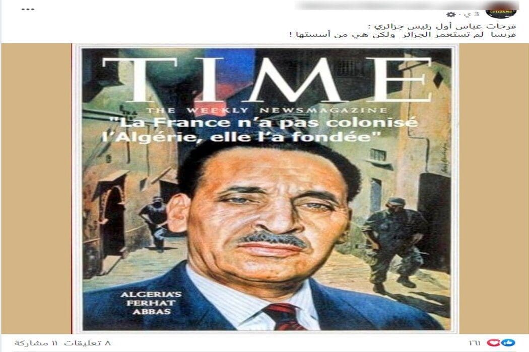 تناقل ناشطون على فيسبوك صورة يزعمون أنها تُظهر غلاف مجلة التايم الأمريكية يتضمن صورة للسياسي الجزائري فرحات عباس،