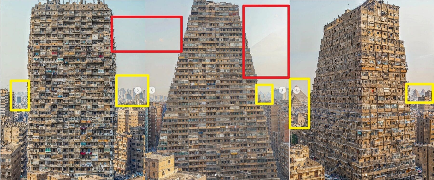 مثل التشوهات الواضحة في خلفية الصور، شكل المبنى السكني غير المنتظم وحجمه الضخم مقارنة بالأبنية حوله،