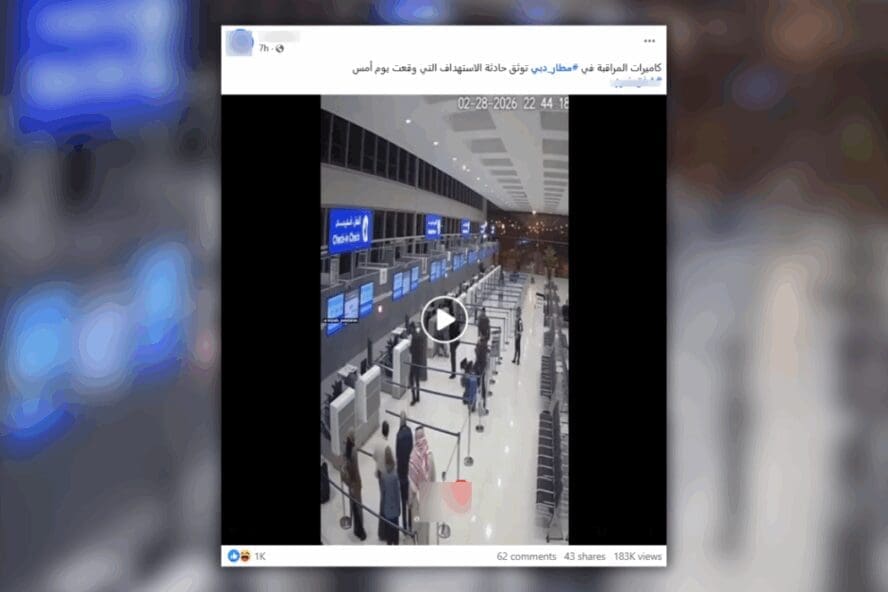 نشر أحد حسابات منصة فيسبوك الادعاء بتاريخ 2 مارس 2026، مرفقًا بالنص الوصفي التالي -دون تصرف-: كاميرات المراقبة في #مطار_دبي توثق حادثة الاستهداف التي وقعت يوم أمس حصد الفيديو اكثر…