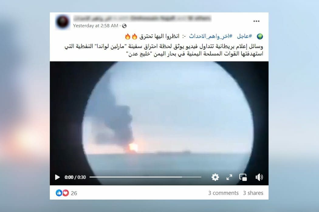 هذه الصورة ليست من استهداف ناقلة النفط البريطانية في خليج عدن مؤخراً، بل لاحتراق سفينة شحن عام 2019 في البحر الأحمر