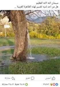 فسبب تدفق الماء من أي شجرة يعود إلى وجود مصدر للماء تحت الشجرة إما مياه جوفية أو أنابيب مياه مكسورة