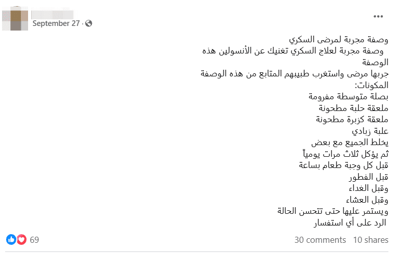 لا يمكن لهذه الوصفة أن تعالج السكري أو تغني المريض عن استخدام الإنسولين والأدوية الموصوفة للسكري