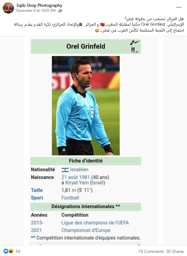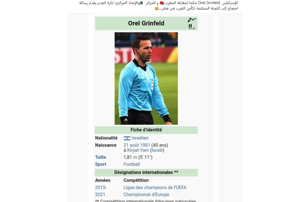 الإسرائيلي Orel Grinfeld حكما لمقابلة المغرب🇲🇦 و الجزائر 🇩🇿والإتحاد الجزائري لكرة القدم يقدم رسالة احتجاج إلى اللجنة المنظمة لكأس العرب في قطر…