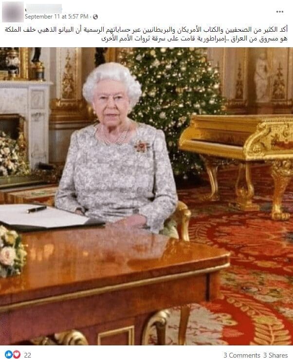 انتشرت على مواقع التواصل الاجتماعي صورة يزعم ناشروها أنها تظهر البيانو الذهبيّ بجانب الملكة إليزابيث الذي سرق من قصر صدام حسين، فما حقيقة هذا الادعاء؟