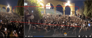 مطابقة مشاهد الادعاء – إلى اليسار – مع فيديو متداول منذ 07 أبريل 2023 لتظاهرة في المسجد الأقصى