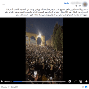 هذا الفيديو مفبرك والفيديو الأصلي يعود لوقفة أمام المسجد الأقصى ردد خلالها المشاركون هتافات وطنية، ولا يظهر إقامة حفلات غناء في المسجد الأقصى
