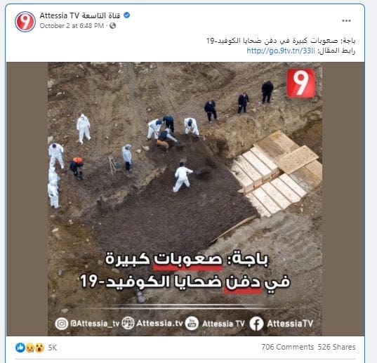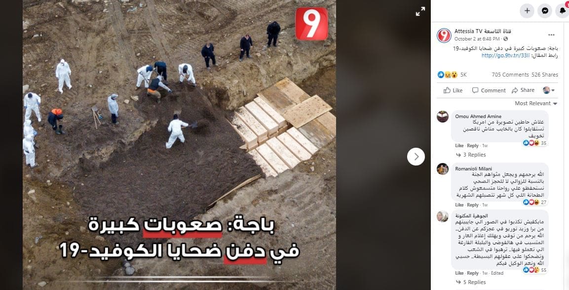 انتشرت صورة على مواقع التواصل الاجتماعي لدفن ضحايا كوفيد19 وادعى ناشروها بأنها تعود لتونس