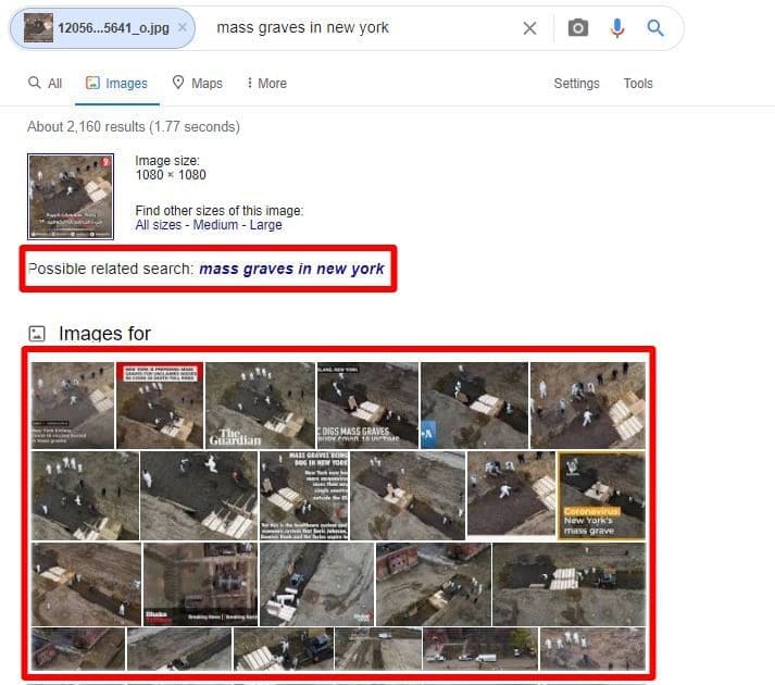يظهر لنا العديد من النتائج المشابهة والمطابقة لصورة الادعاء، وقد تعرّف محرك البحث غوغل على الصورة منشورة تحت عنوان Mass graves in New York