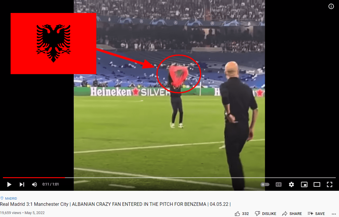 حيث يظهر المشهد في الدقيقة 90 من المباراة عندما قام أحد المشجعين باقتحام أرضية الملعب ورفع العلم الألباني الذي يتوسطه رسم لنسر أسود له رأسين،