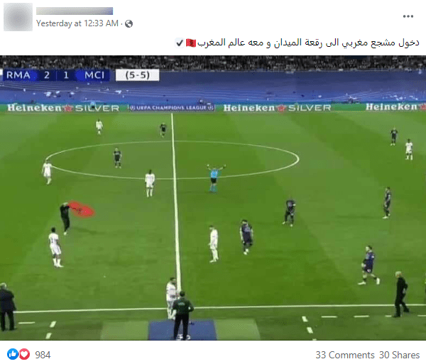 انتشر على مواقع التواصل الاجتماعي صورة يزعم ناشروها أنها تظهر مشجعًا يرفع العلم المغربي خلال مباراة ريال مدريد ومانشستر سيتي،