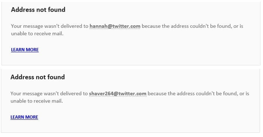 علاوة على ذلك، بمحاولة إرسال رسائل بريد إلكتروني إلى العناوين الظاهرة في الرسالة، فشلت هذه الرسائل بالوصول لتلك العناوين، كما يظهر فيما يلي: