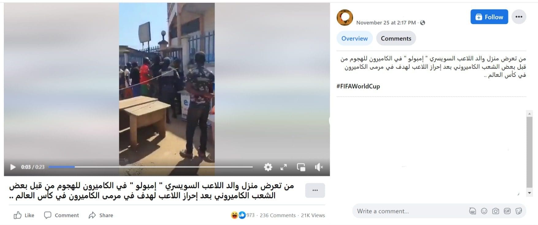 تداول ناشطون على منصات التواصل الاجتماعي مقطع فيديو يدّعون أنه يظهر تعرض منزل والد اللاعب السويسري “بريل إمبولو” في الكاميرون للهجوم من قبل بعض الجماهير الكاميرونية،