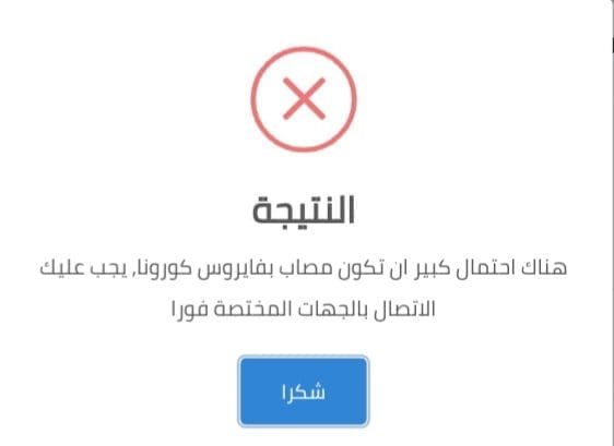 النتيجة هي: هناك احتمال كبير أن تكون مصابًا بفيروس كورونا، يجب عليك الاتصال بالجهات المختصة فورًا.