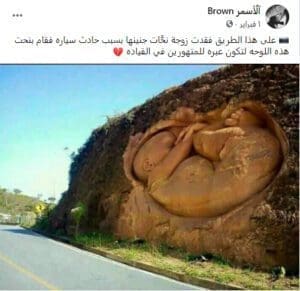 على هذا الطريق فقدت زوجة نحات جنينها بسبب حادث سيارة فقام بنحت هذه اللوحة لتكون عبرة للمتهورين في قيادة المركبات