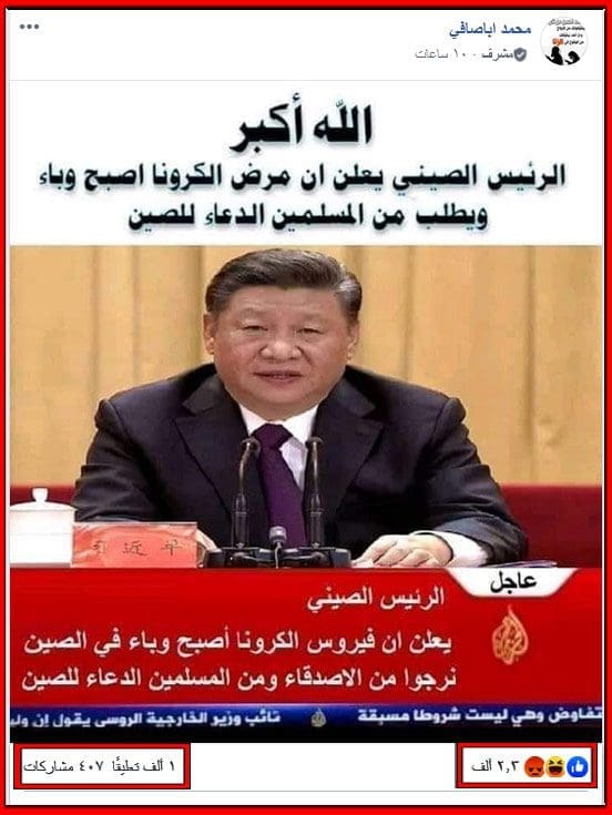 صورة تنتشر بين مرتادي مواقع التواصل الاجتماعي يظهر فيها رئيس دولة الصين وكأنه يلقي كلمة وخبر مكتوب أسفل الصورة عن قناة الجزيرة مفاده أن رئيس دولة الصين يعلن أن مرض كورونا أصبح وباء في الصين ويرجو من الأصدقاء ومن المسلمين الدعاء للصين