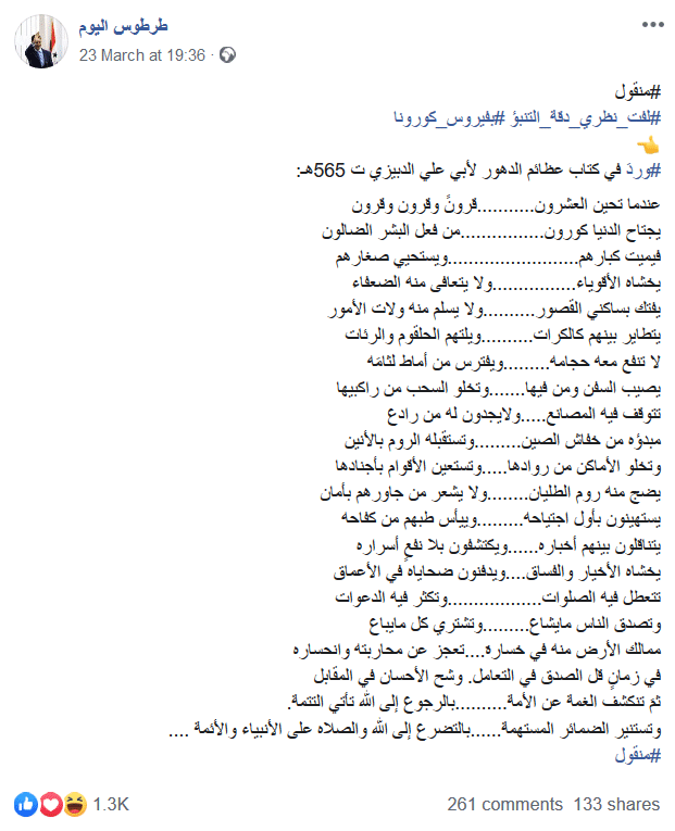 تم تداول قصيدة على وسائل التواصل الاجتماعي زعم عنها التنبؤ بكورونا وقد وردت في كتاب عظائم الدهور لأبي علي الدبيزي تاريخ 565هـ.