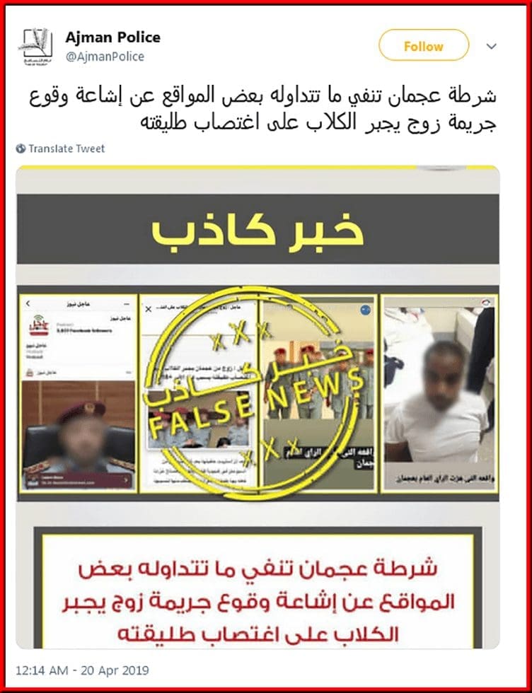 نفت القيادة العامة لشرطة عجمان ما تداولته بعض المواقع ووسائل التواصل الاجتماعي من أخبار وتصريحات منسوبة لضباط من الشرطة حول وقوع جريمة زوج يجبر الكلاب على اغتصاب طليقته في واقعة هزت الرأي العام في إمارة عجمان.