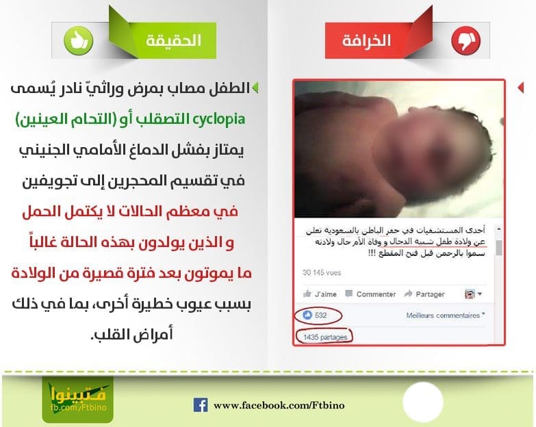 – الطفل مصاب بمرض وراثيّ نادر يُسمى cyclopia التصقلب أو (التحام العينين) يمتاز بفشل الدماغ الأمامي الجنيني في تقسيم المحجرين إلى تجويفين.