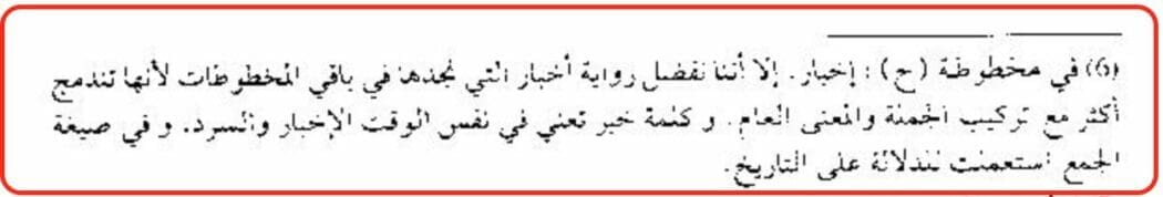 وقد فضّل المحقق “عبد السلام الشدادي” لفظة ( أخبار ) استنادا على المخطوطات المثبتة لديه، واعتبارا لانسجامها مع تركيب الجملة والمعنى العام.