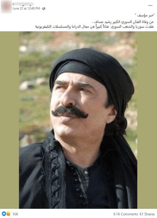 نشرت إحدى صفحات فيسبوك صورة للفنان السوري رشيد عساف بتاريخ 22 يونيو 2022 مرفقة بالتعليق الآتي -من دون تصرّف-: