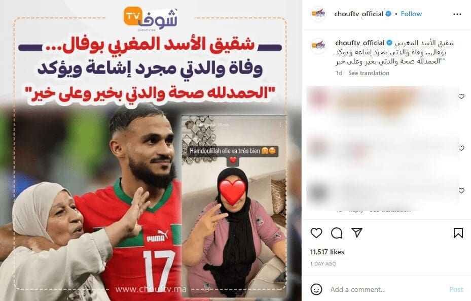 فيما نشرت مصادر مغربية محلية نفي عن وفاة والدة اللاعب، معتمدين على منشور نشره اشقاء اللاعب المغربي على الانستغرام عبر خاصية القصص،
