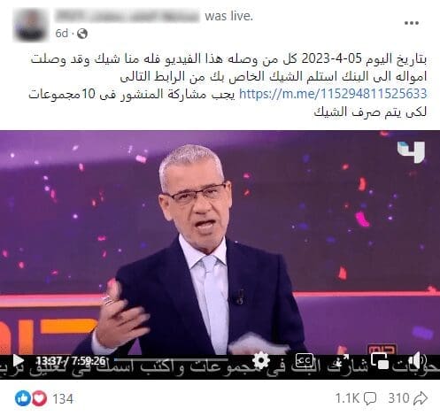 تناقل بعض الناشطين على منصة الفيسبوك مسابقة تدّعي وجود جائزة (شيك) تحصل عليها بعد مشاركة مقطع فيديو في مجموعات الفيسبوك.