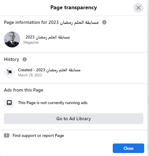 1- بالبحث في الصفحة الناشرة للمسابقة في منصة الفيسبوك، تبين أنها أنشئت حديثًا (29 مارس 2023)