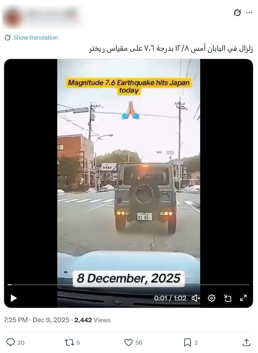 بحسب فرانس 24 –دون تصرف-: «ضرب زلزال عنيف بلغت قوته 7.6 درجات شمال اليابان الإثنين، متسببا في إصابة 30 شخصا على الأقل، وإلحاق أضرار بالبنية التحتية وانقطاع الكهرباء عن آلاف المنازل، وفق ما أعلنت السلطات الثلاثاء»، في هذا السياق تداول ناشطون على منصات التواصل الاجتماعي مقطع فيديو يدّعون أنه يصور مشاهد من هذا الزلزال.
