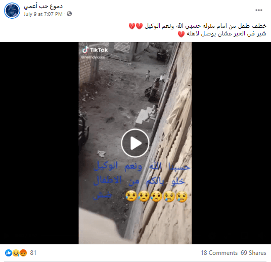 نشرت صفحة دموع حب أعمي على موقع التواصل الاجتماعي فيسبوك مقطع فيديو وأرفقته بالنص الوصفي الآتي (من دون تصرّف):