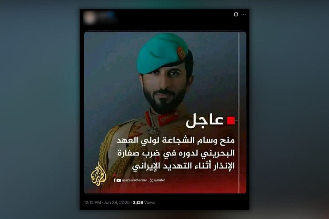 لا صحة لخبر منح وسام الشجاعة لولي العهد البحريني لدوره في تشغيل صفارات الإنذار أثناء التهديد الإيراني، كما أن قناة الجزيرة لم تنشر هذا الخبر