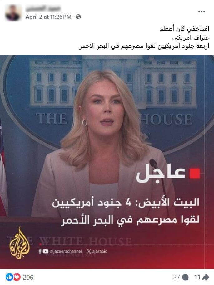 بحسب فرانس24 –دون تصرف-: «منذ يوم 17 آذار/مارس الجاري، تخوض الولايات المتحدة الأمريكية وجماعة الحوثي في اليمن التي تلقى الدعم من إيران وتتهمها واشنطن بتهديد التجارة البحرية الدولية، مواجهة عسكرية في اليمن وفي مياه البحر الأحمر. وفي الوقت الذي استهدفت فيه الغارات الجوية الأمريكية العاصمة اليمينة صنعاء ومعقل الحوثيين في شمال البلاد» في هذا السياق تداول ناشطون على الفيسبوك صورة يدعون فيها مصرع أربعة جنود أمريكيين في البحر الأحمر.