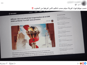 بدأ العد التنازلي لكأس أمم إفريقيا، المغرب 2025، توتال إنيرجيز، رسميًّا، حيث تستعد المغرب لاستضافة المنافسة الكروية الأكبر في القارة الإفريقية للمرة الثانية في تاريخها، في هذا السياق، تناقل ناشطون على فيسبوك خبرًا منسوبًا لموقع فوت أفريكا الرياضي، يدعون خلاله أن الموقع نشر مقالًا يفيد بأن الاتحاد الأفريقي لكرة القدم يدرس سحب تنظيم البطولة من المغرب،