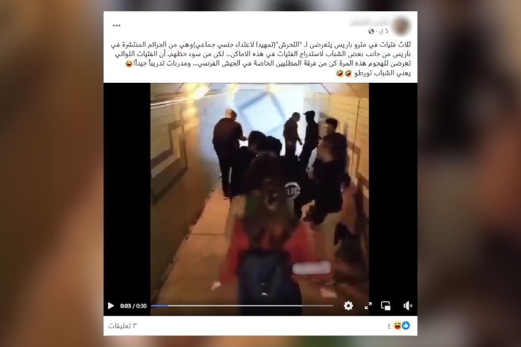 هذا الفيديو يظهر جزءًا من تمرين تابع لمركز تدريب على أدوار القتال في السينما في فرنسا ولا يظهر تعرض فتيات للتحرش في مترو أنفاق في باريس