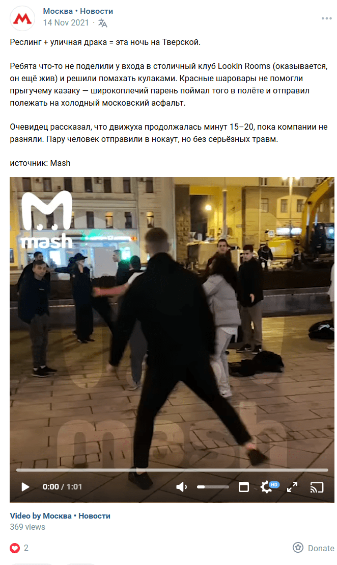 وأشارت المصادر التي نشرت المقطع آنذاك أنها تصوّر لقطات من شجارٍ وقع في شارع تفيرسكايا بوسط موسكو، عند مدخل نادي Lookin Rooms الليلي في العاصمة،