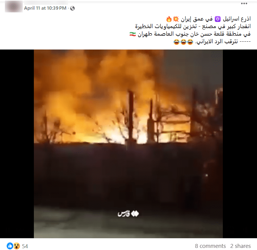 كانت قد نشرت المقطع ذاته في 15 فبراير 2024 على أنه لانفجار في مصنع للكيماويات في شهريار، بالقرب من مدينة طهران.