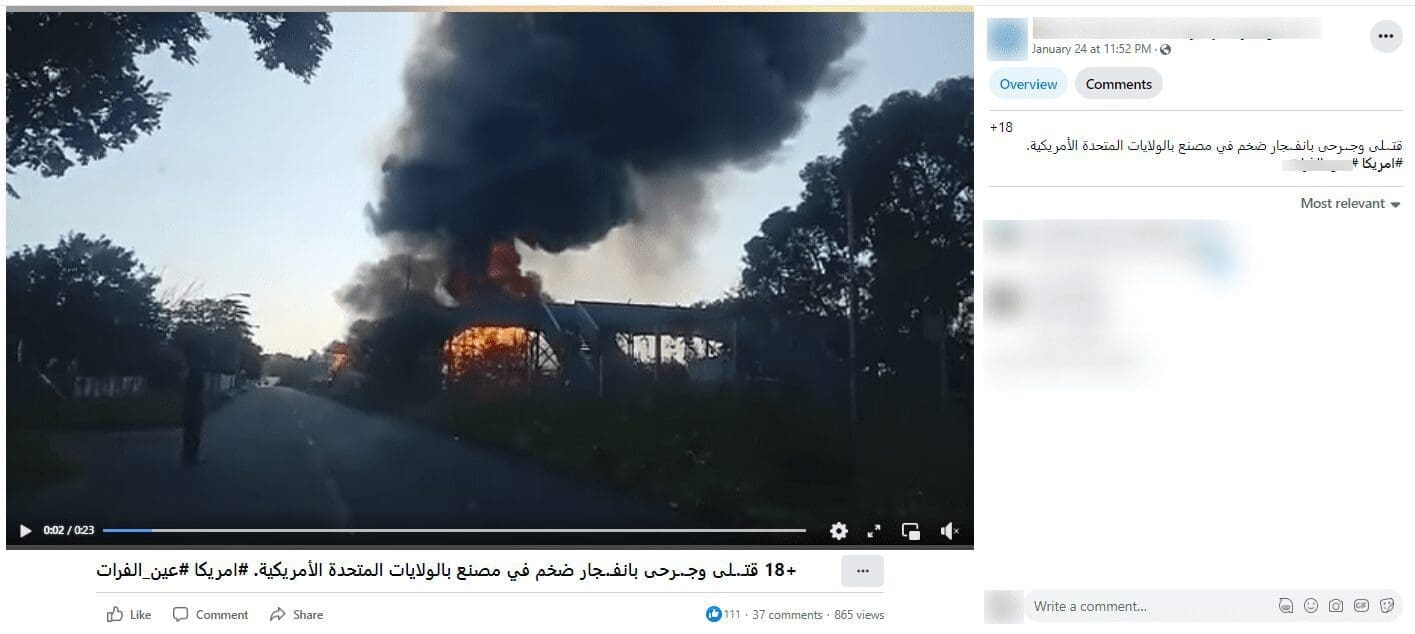 انتشر على مواقع التواصل الاجتماعي مقطع فيديو يدعي ناشروه أنه يظهر انفجارًا ضخمًا وقع مؤخرًا في مصنعٍ في الولايات المتحدة الأمريكية.