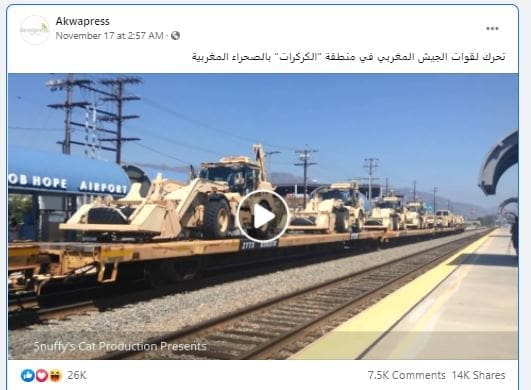 انتشر مقطع على موقع التواصل الاجتماعي فيسبوك لتحرك قطار يحمل العشرات من الدبابات وعربات الجيش وادعى ناشروه بأنه يعود لتحرك قوات الجيش المغربي إلى الكركرات