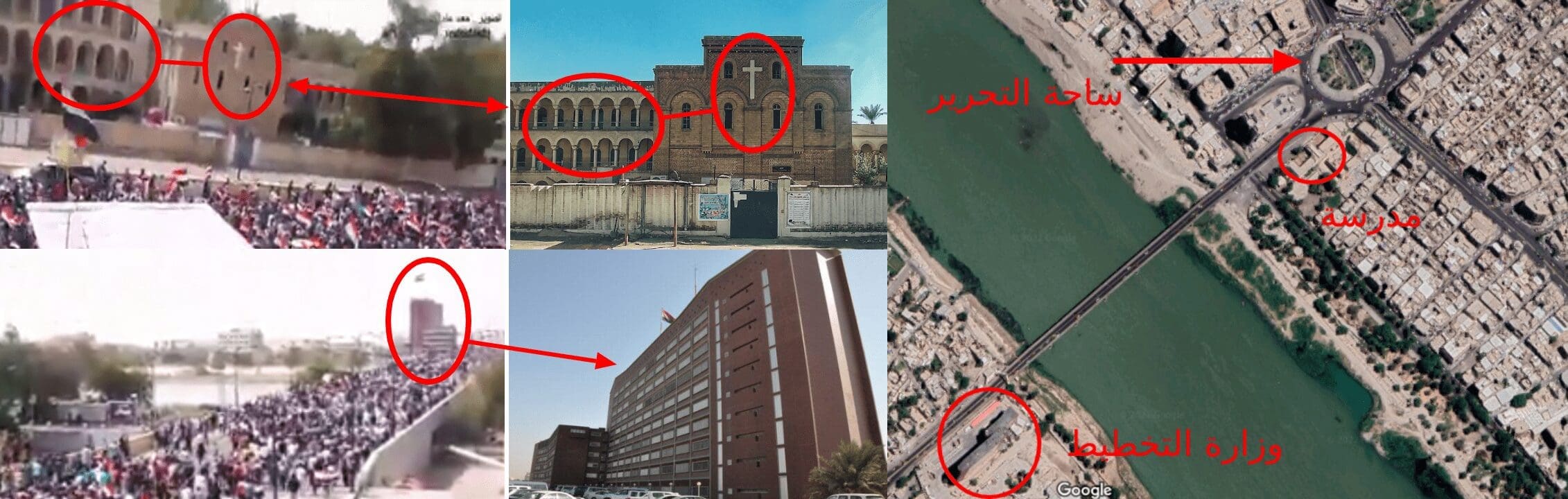 حيث يظهر في الفيديو مبنى وزارة التخطيط ومبنى مدرسة ثانوية،