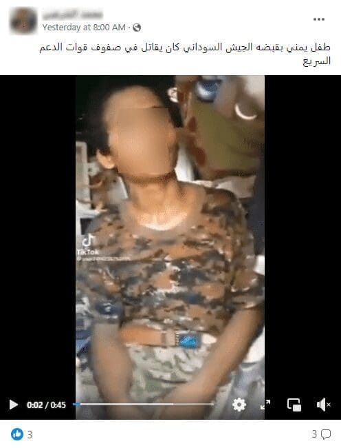 تناقل ناشطون على فيسبوك مقطعًا يدّعون أنه يظهر قبض الجيش السوداني على طفل يمني كان يقاتل في صفوف قوات الدعم السريع.