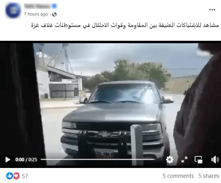مما يثبت أن المقطع مصور في المكسيك ، وبمجرد وجود المقطع متداول منذ ٢٠١٧ ينفي أن يكون له أي علاقة بالأحداث الجارية في غلاف قطاع غزة.
